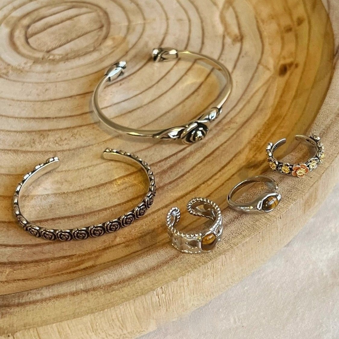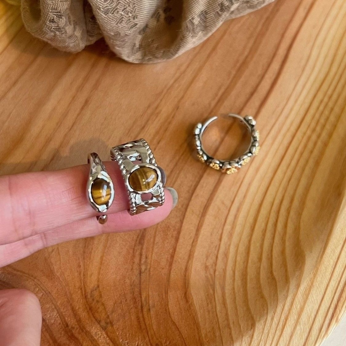 Colors: Narrow tiger’s eye ring, wide tiger’s eye ring, gold floral ring
